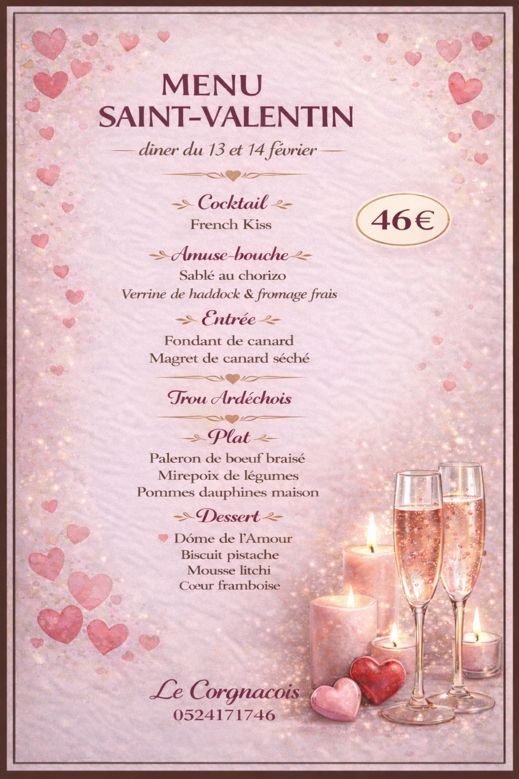 Pour célébrer l’amour, notre chef a imaginé un menu d’exception, mêlant finesse, générosité et émotions. Du cocktail au dessert, chaque assiette a été pensée pour éveiller les sens et sublimer ce moment à partager à deux. Une expérience gastronomique délicate et chaleureuse, idéale pour une soirée placée sous le signe de la complicité et de la gourmandise.
